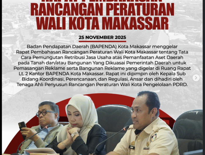 HARSYANEWS.ID, MAKASSAR — Badan Pendapatan Daerah (Bapenda) Kota Makassar menggelar Rapat Pembahasan Rancangan Peraturan Wali Kota (Perwali) Makassar terkait Tata Cara Pemungutan Retribusi Jasa Usaha atas Pemanfaatan Aset Daerah pada tanah dan/atau bangunan yang dikuasai pemerintah daerah untuk pemasangan reklame. Kegiatan ini berlangsung di Ruang Rapat Lantai 2 Kantor Bapenda Kota Makassar.